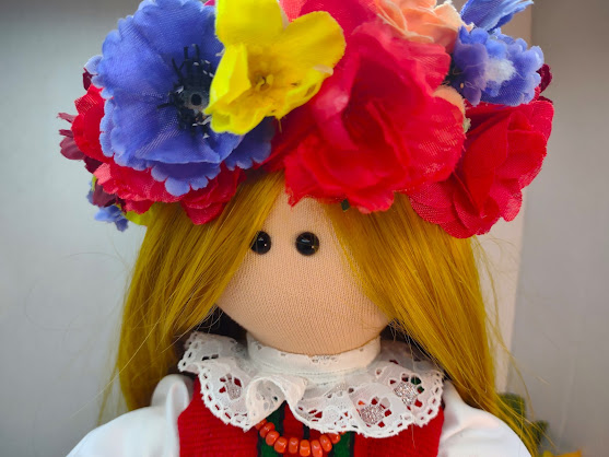 Lalka ma na głowie wianek a w ręce typową chustkę z frędzlami. Sukienka w czerwonym kolorze z cienkimi paskami żółtymi i zielonymi z wełnianej, typowej tkaniny. Fartuch biały, haftowany, Bluzka białą z kryzą z koronki przy szyi. Stroju dopełniają czerwone korale.